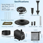 - All-in-One-Set für den sofortigen Einsatz: Dieses Komplettset enthält alles, was Sie brauchen: eine 660-GPH-Pumpe, einen schwimmenden Sockel, LED-Leuchten, drei Düsen, Schläuche und Verankerungszubehör. Ob für Gartenteich, Pool oder Wasserfall – dieser Brunnen verwandelt Ihr Wasserspiel im Handumdrehen.