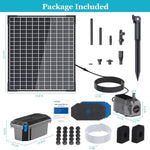 A: The kit includes: 1* 25W solar panel, 1* filter box, 1* pump, 4* nozzles & diverter valve, 2* filter pads, 20* bio-balls, 2* Velcro straps, and 1* user manual.