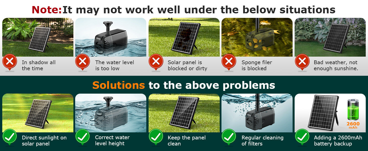 Clean the pump and replace or rinse the filter sponges regularly to prevent clogging. Ensure the solar panel remains unobstructed for consistent performance.