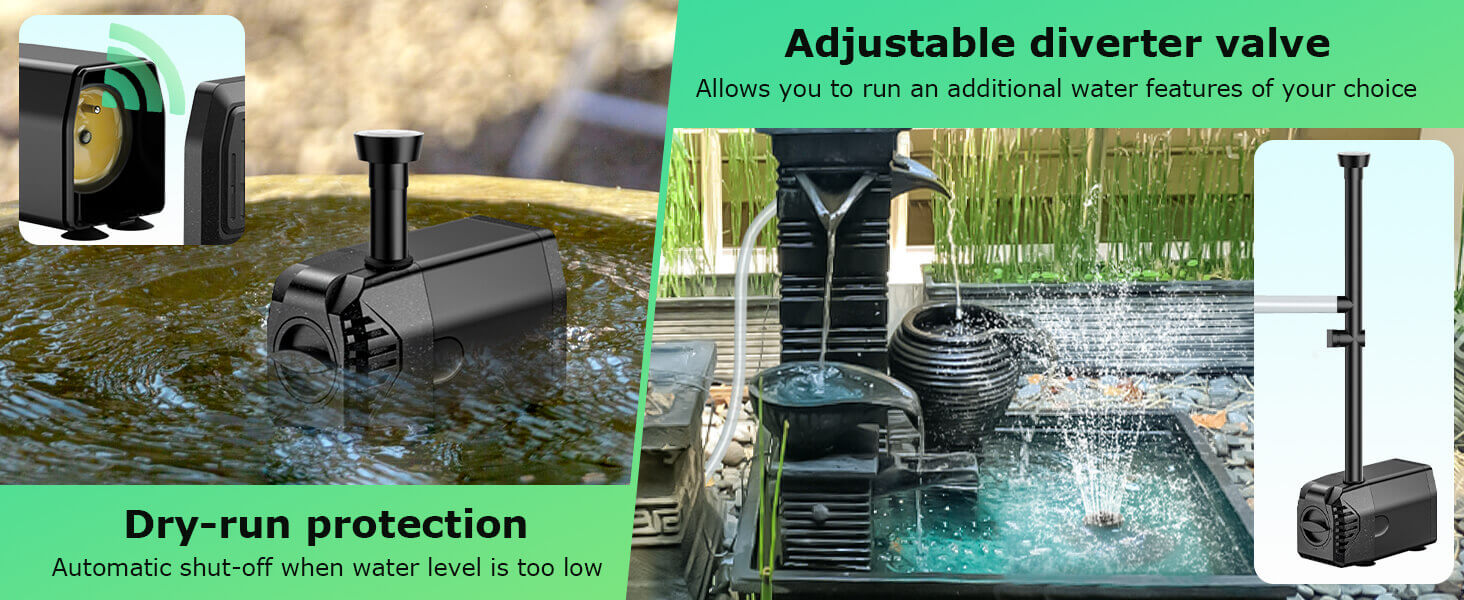 Absolutely. The pump is equipped with dry-run protection to prevent motor burnout when water is too low. It also features a two-way filter system to prevent clogging.